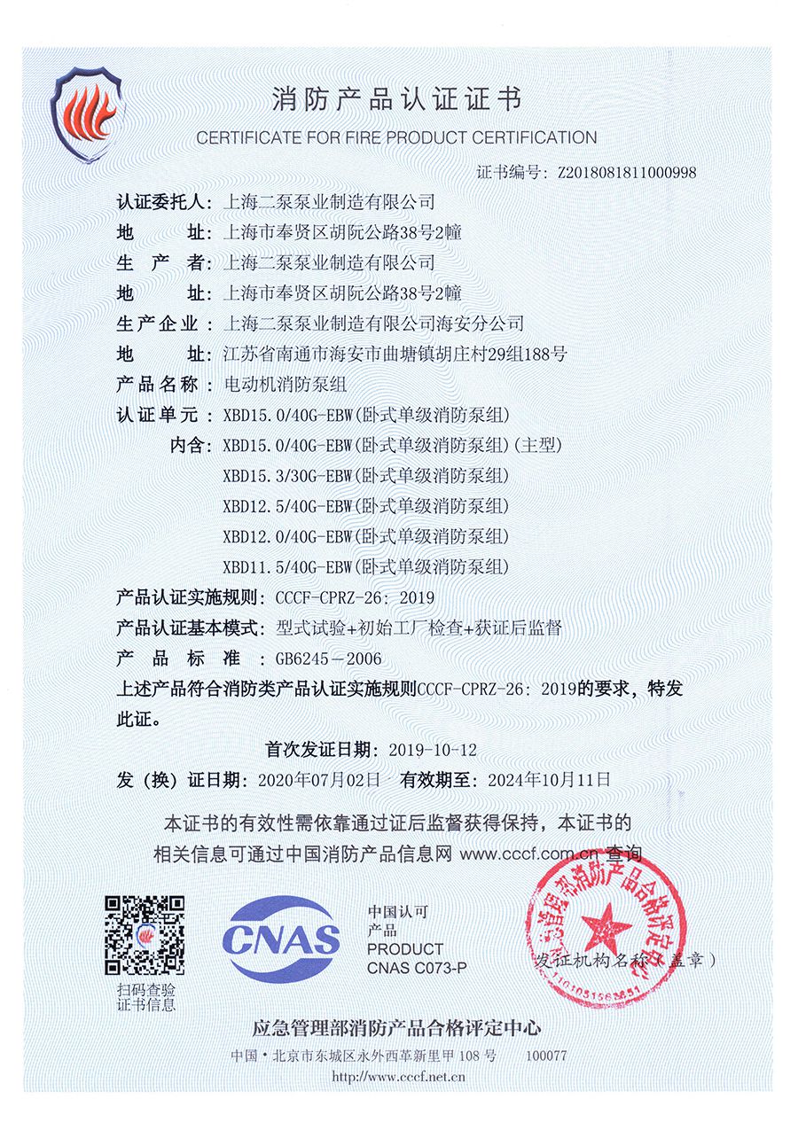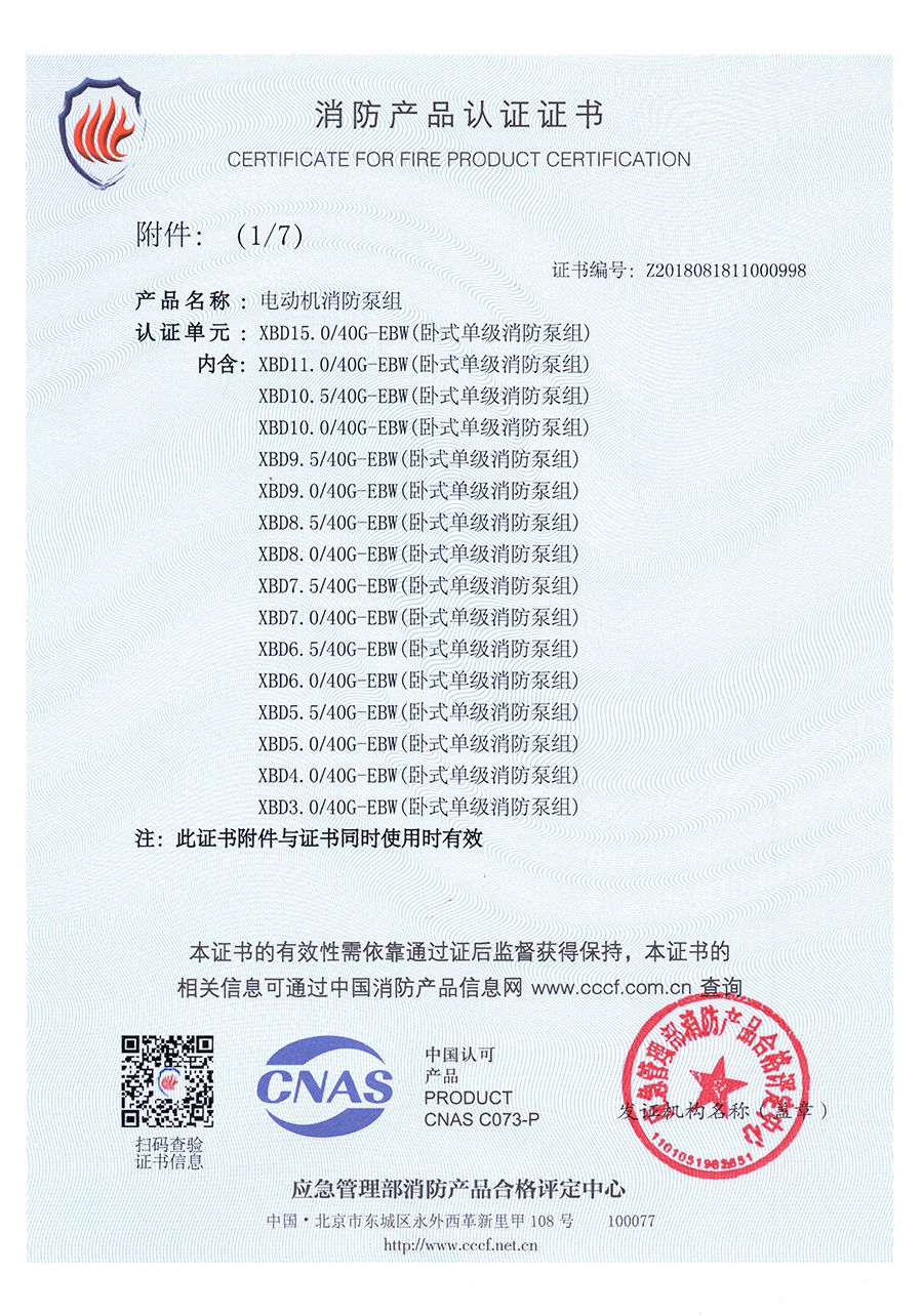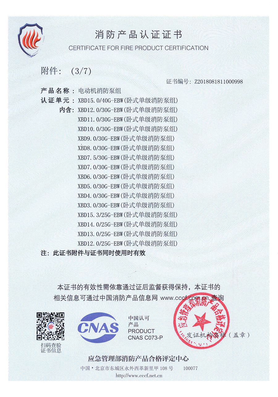 臥式單級(jí)EBW-消防產(chǎn)品認(rèn)證證書