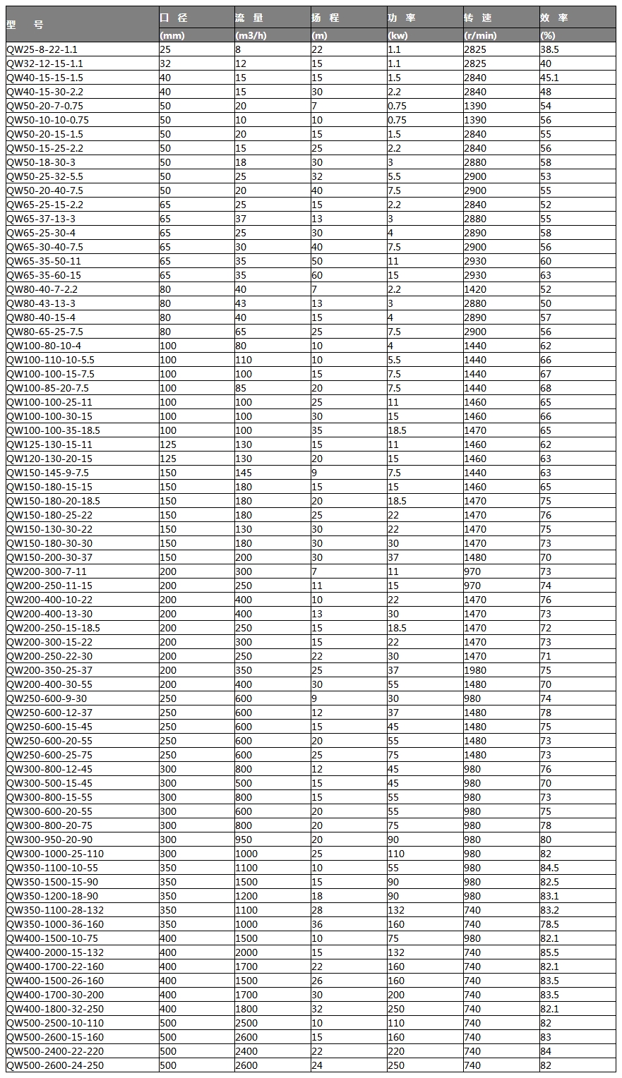 QW 50 - 20 - 15 - 1.5 | | | | |__ 電機功率:KW | | | |_________ 額定揚程H:M | | |_______________ 額定流量Q:M3/H | |_____________________ 出水口徑直徑MM |____________________________ 移動式無堵塞潛水排污泵
