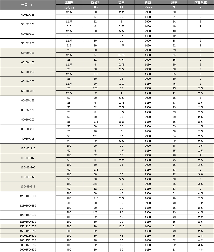 IH型系列泵有29個基本型,其中22個雙速(2900、1450r/min)經過A、B兩種型式的葉輪直徑切割變型后,達112個規格。